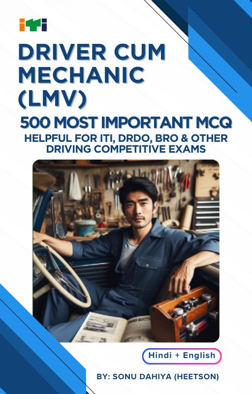 Driver Cum Mechanic MCQ (LMV) Book. Prepare confidently for your ITI exams with this Hindi-language PDF. It contains 500 multiple-choice questions, carefully selected from past years’ exam papers, NIMI resources, and the Bharat Skills question bank. Also helpful for driver cum fitter, DRDO, BRO & other driving competitive exams.